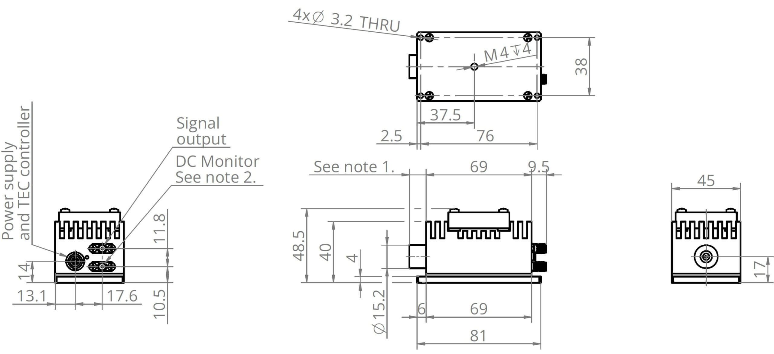 Note 1. TO8 detector dimensions in the TO8 package technical drawings. Note 2. Only for FIP-xx-1G-D version.