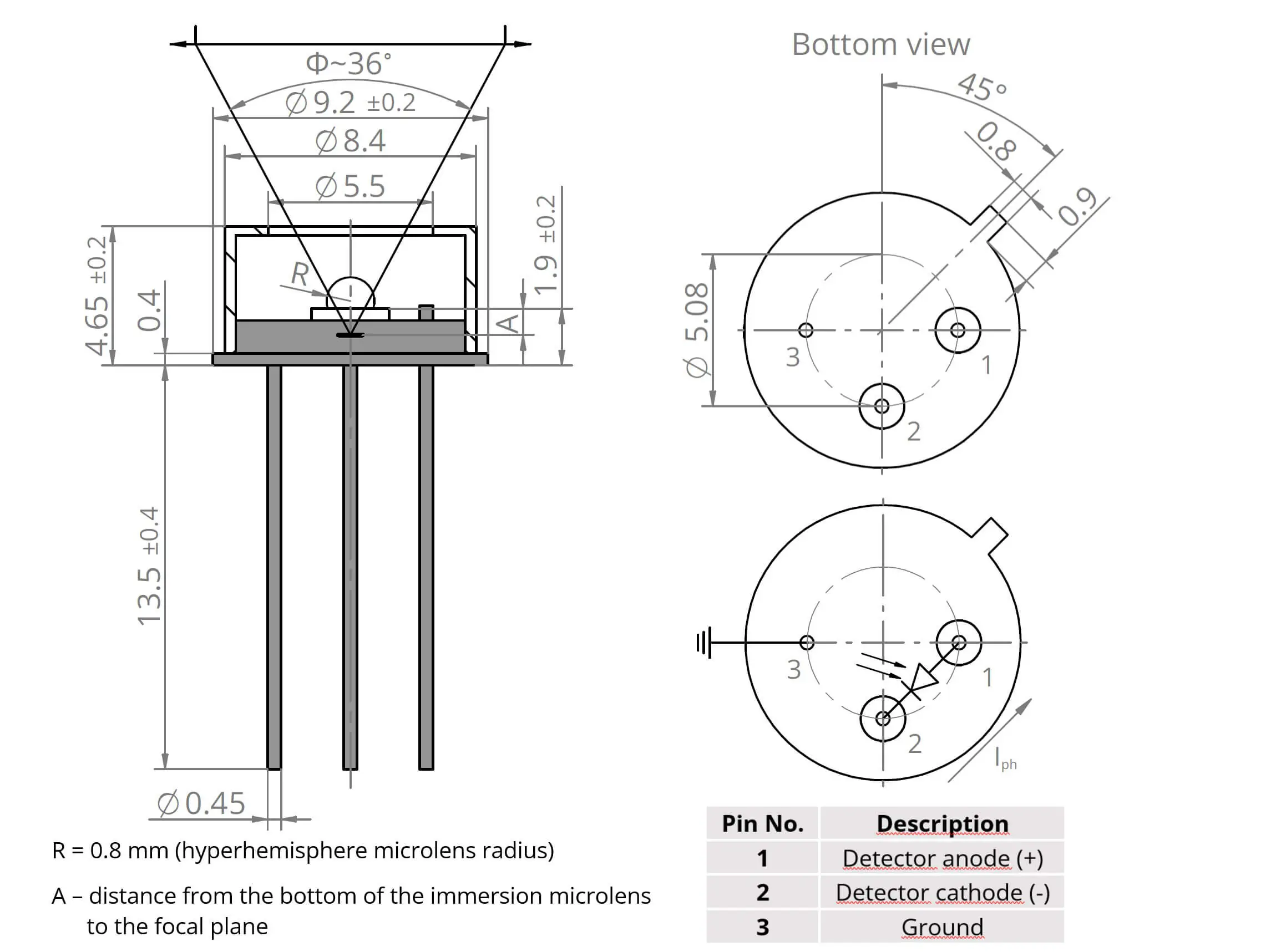PVIA-5-1×1-TO39-NW-36 is a room-temperature IR photovoltaic detector based on InAsSb heterostructure. It enables the detection of radiation in the range from 2.6 μm to 5.3 μm. The detector element is monolithically integrated with hiperhemispherical GaAs microlens in order to improve the performance of the device. The detector is mounted in the TO39 package without a window. It is mercury and cadmium-free and is fully compliant with the RoHS Directive.