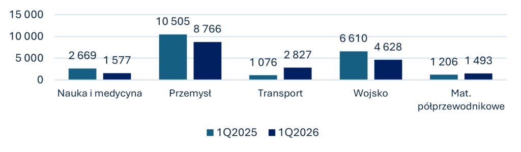 Wartość przychodów wg. aplikacji 1Q2026/1Q2025